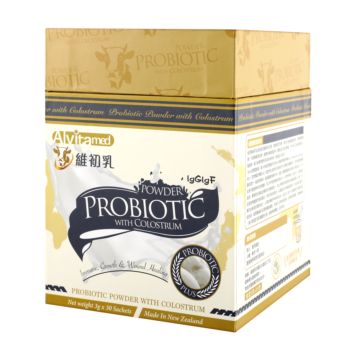 每100克紐西蘭維初乳含83.4億動物雙歧桿菌 BB-12 (Bifidobacterium Animalis BB12)。動物雙歧桿菌 BB-12 是世界上臨床研究最為充分的雙歧桿菌菌株,它的特質是耐胃酸和膽汁,能抵禦胃液,直達腸道發揮作用,調節人體腸道菌群和提高人體免疫力。初乳素不僅含有牛奶低聚醣,可以用作動物雙歧桿菌 BB-12 的食物來源(益生元)並促進其生長,更有效地使益生菌黏附在腸細胞上,阻止病毒和有害物質在腸道細胞上生長。初乳素含有豐富的免疫蛋白,例如免疫球蛋白,乳鐵蛋白和多種細胞因子。這些蛋白質已顯示出能抵抗胃部消化,以便在腸道中保持其活性,並且可以進一步調節微生物群和免疫系統。